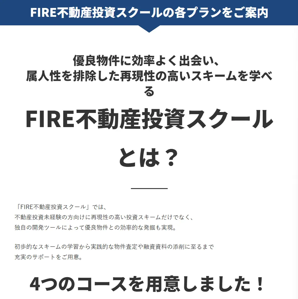 一言でまとめると、「高額な不動産投資スクール商材で、複数コースを期間ベースで設定し、チャット・Zoomコンサル・現地同行などをパッケージに含む情報提供型パッケージ」です。