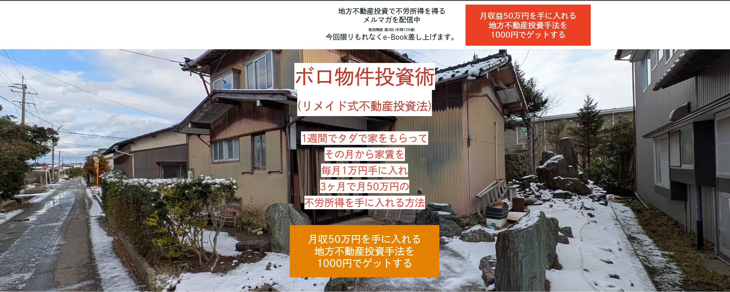 一言でまとめると、「地方のボロ物件を“タダ同然”または極端な低価格で取得し、リフォーム・家賃収入で利回りを飛躍させる手法を教える有料配信型教材・メールマガジン商材」です。