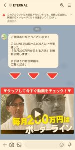・ETERNAL(エターナル)は「LINE通知だけで毎月200万円」など、実態より期待が先行しやすい設計に見えます。