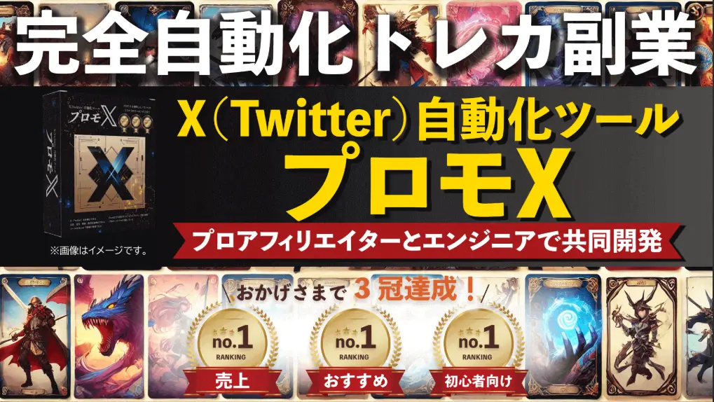 一言でまとめると、『X(旧Twitter)の自動化ツール「プロモX」とその活用ノウハウを核にした“トレカ副業系アフィリエイト”情報商材』です。
