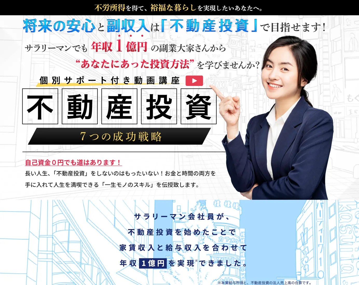 『サラリーマンでも取り組みやすいと謳う「不動産投資の7つの成功戦略」を体系的に学び、メールサポート(1年間)付きで物件を買い進めて資産拡大を目指す学習商材』です。